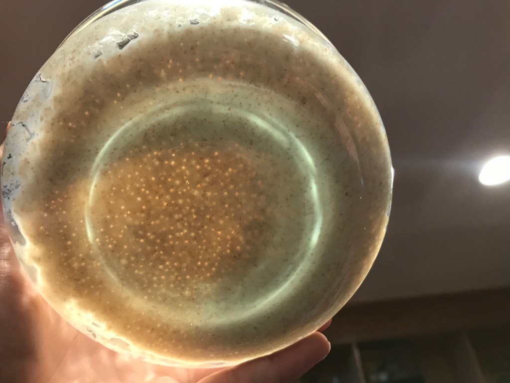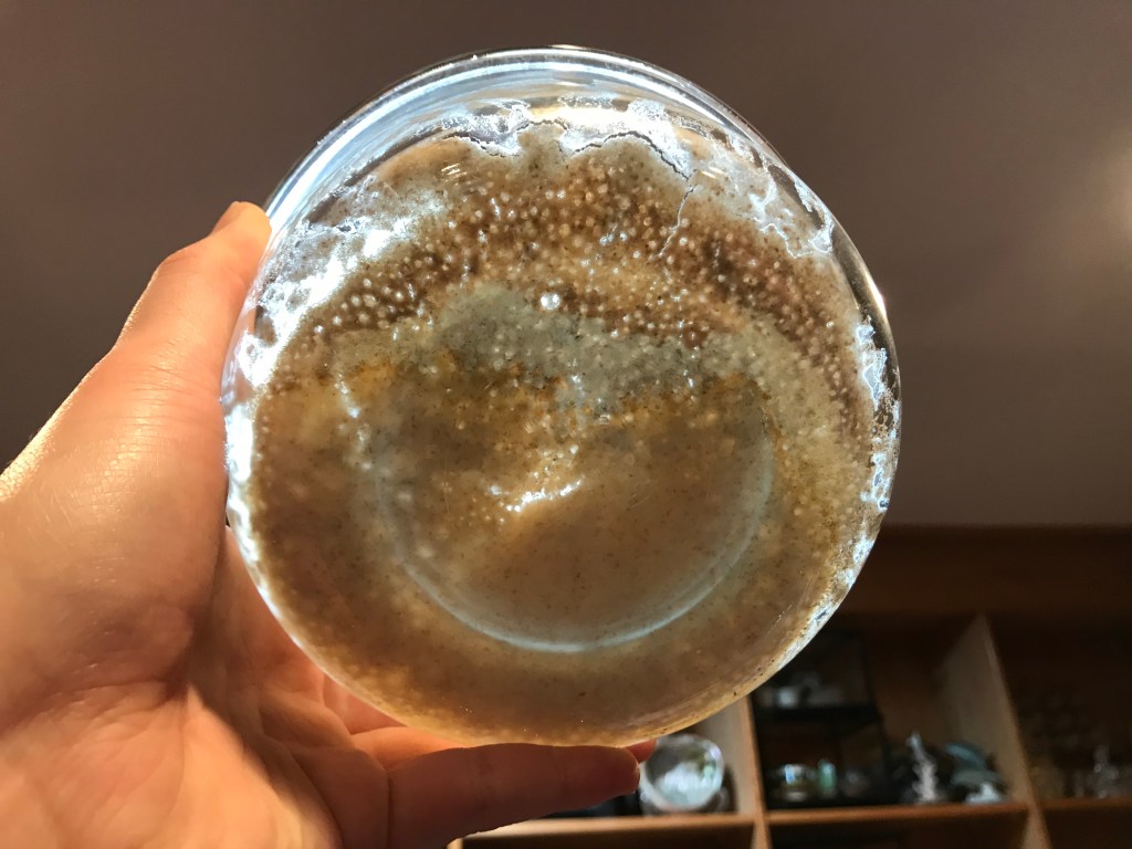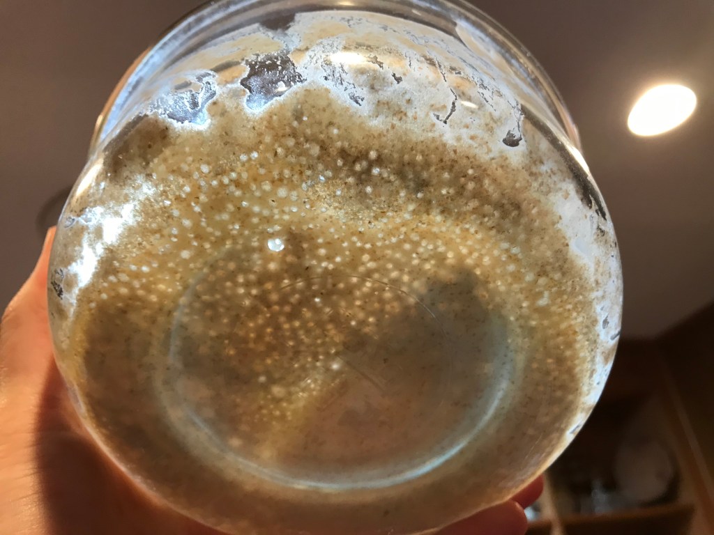 Hello darkness my own friend. The 1st culture now has the barf smell and perhaps initial mold growth due to the dark brown color. ‘Tapioca gas balls’ can still be seen at bottom.