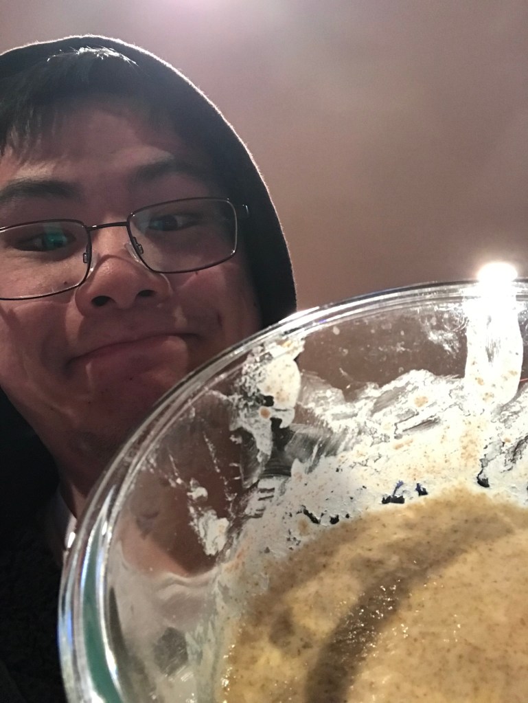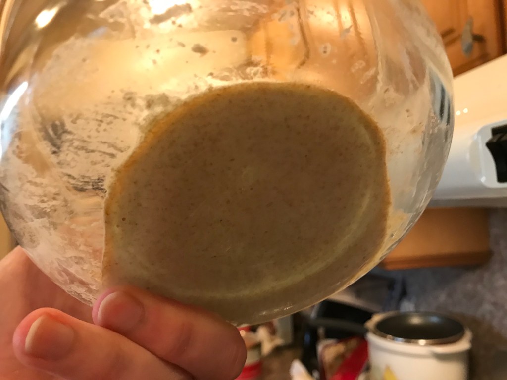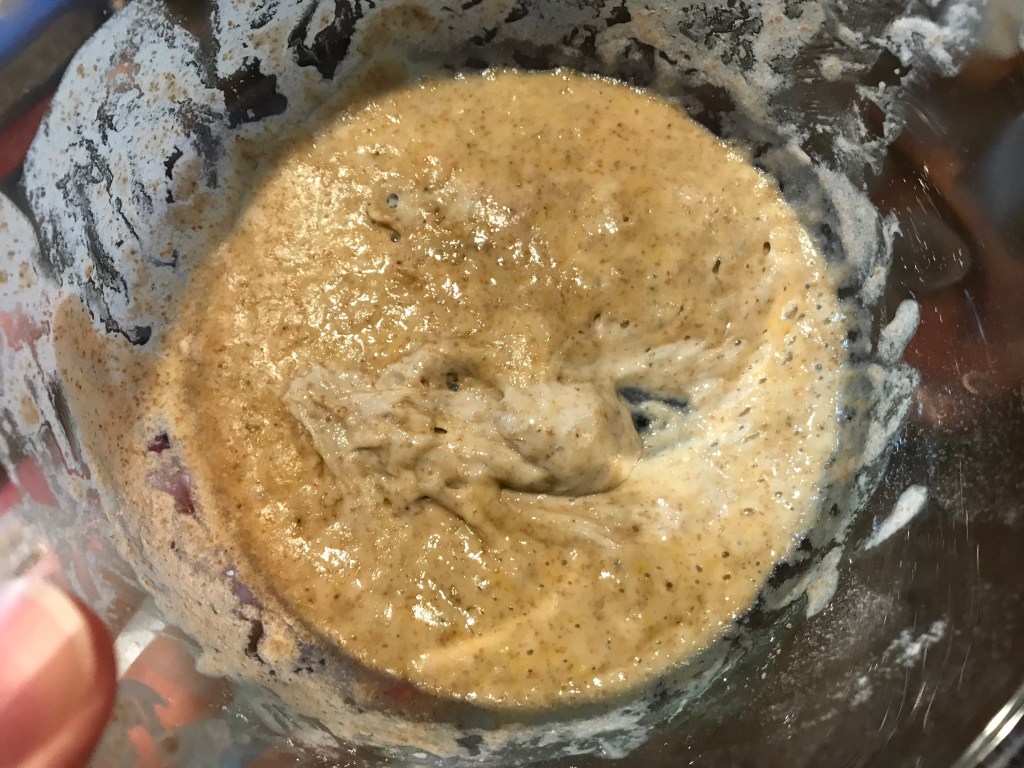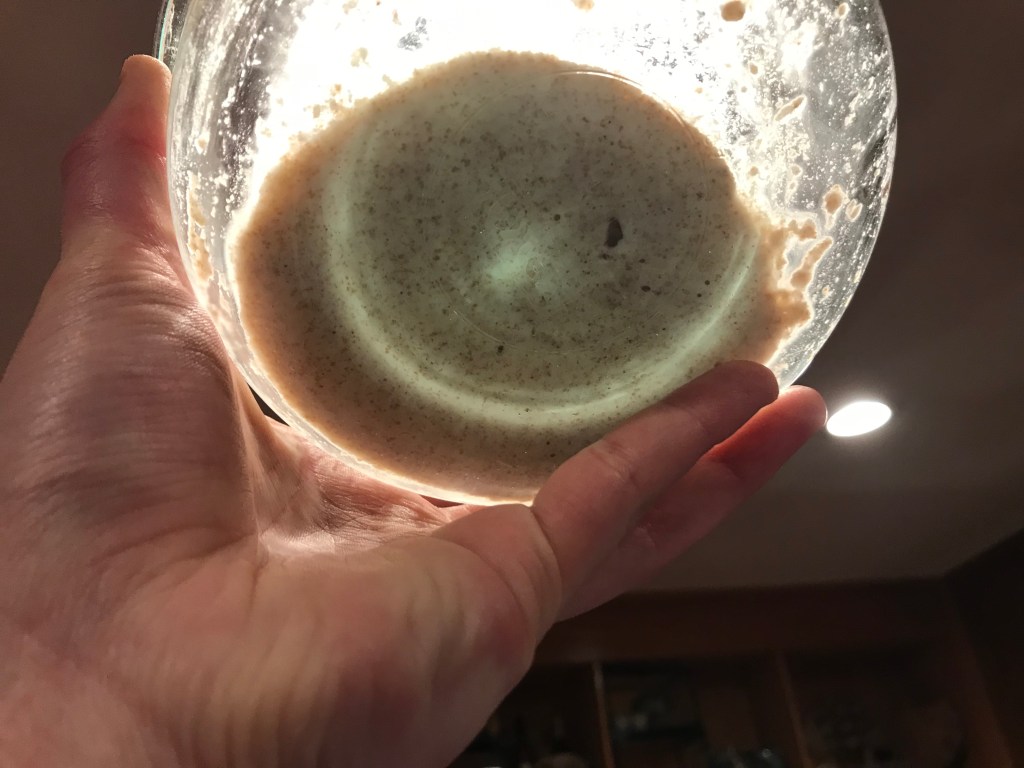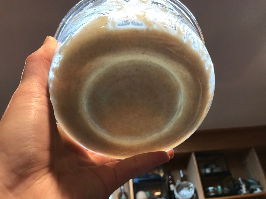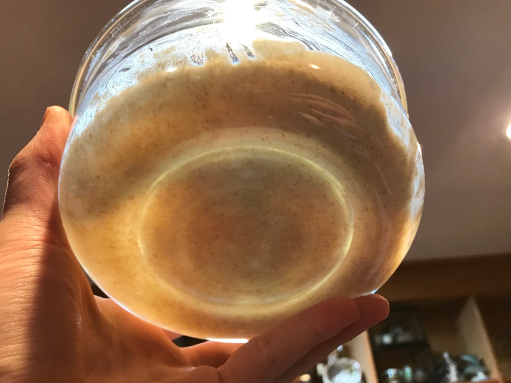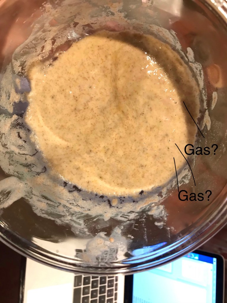 The dough mix smell like a whole wheat dough with a bit of sourness. A few bubble pop on surface but the bottom doesn’t? Can’t really tell it might be gas at the bottom but right now they look like tapioca balls. xD