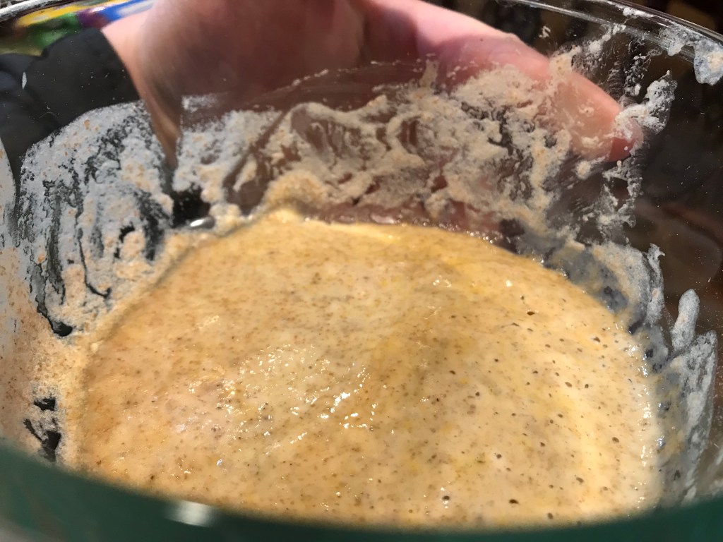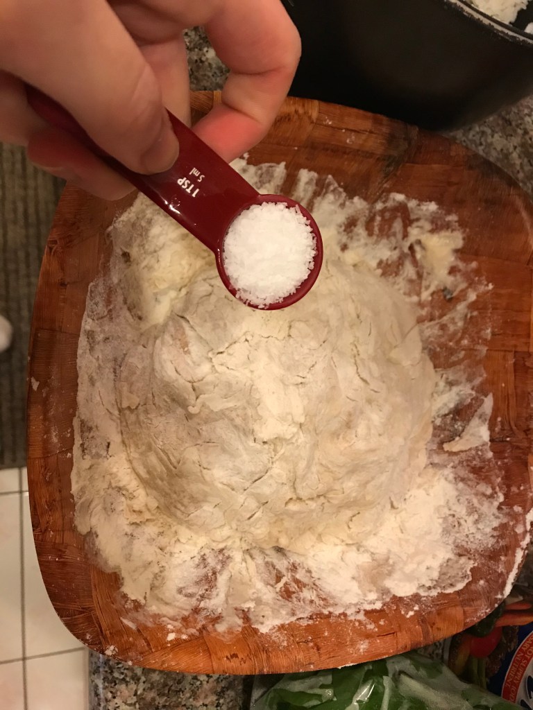 I initially mixed with a spoon then processed my hands for form a lump. After the initial 30 minutes, 1.5 TSP of Kosher salt was added and mixed with my hand.