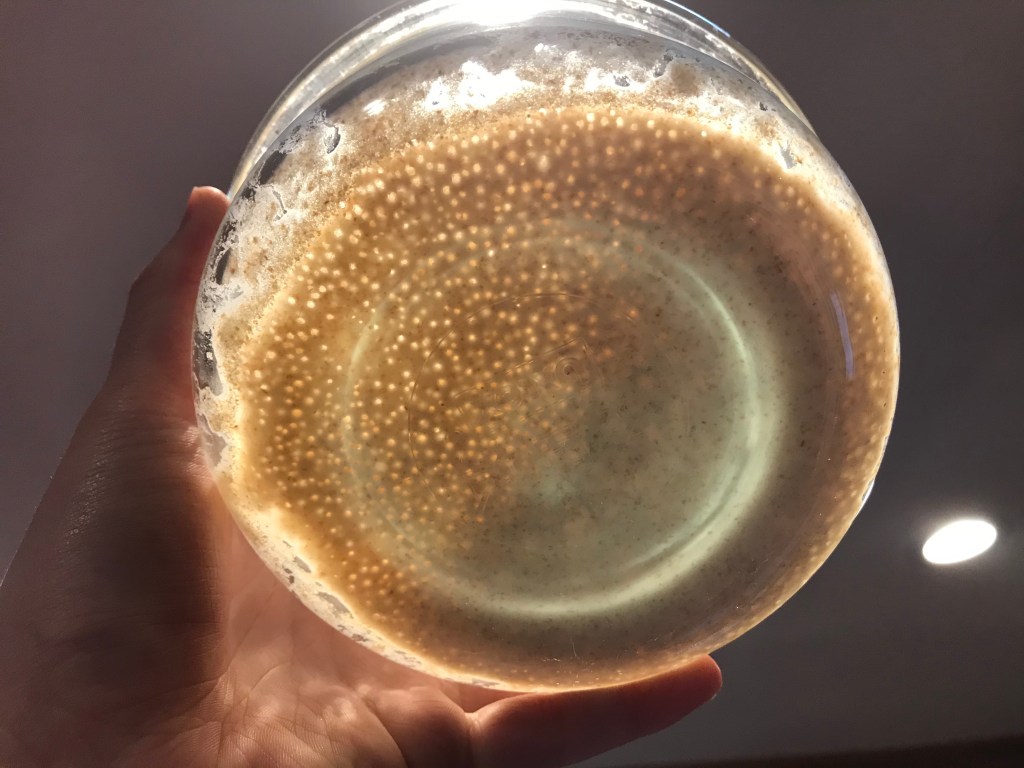 Smell is much more wet and sour. Seems like the “tapioca balls” at the bottom are the gas formation. More have formed and the surface of the flour mix has a soggy-looking layer. Woolalala. Science!