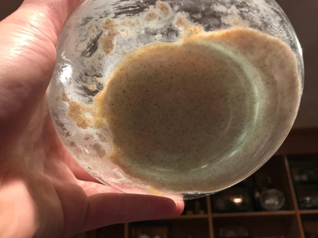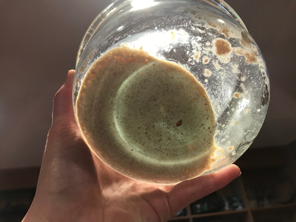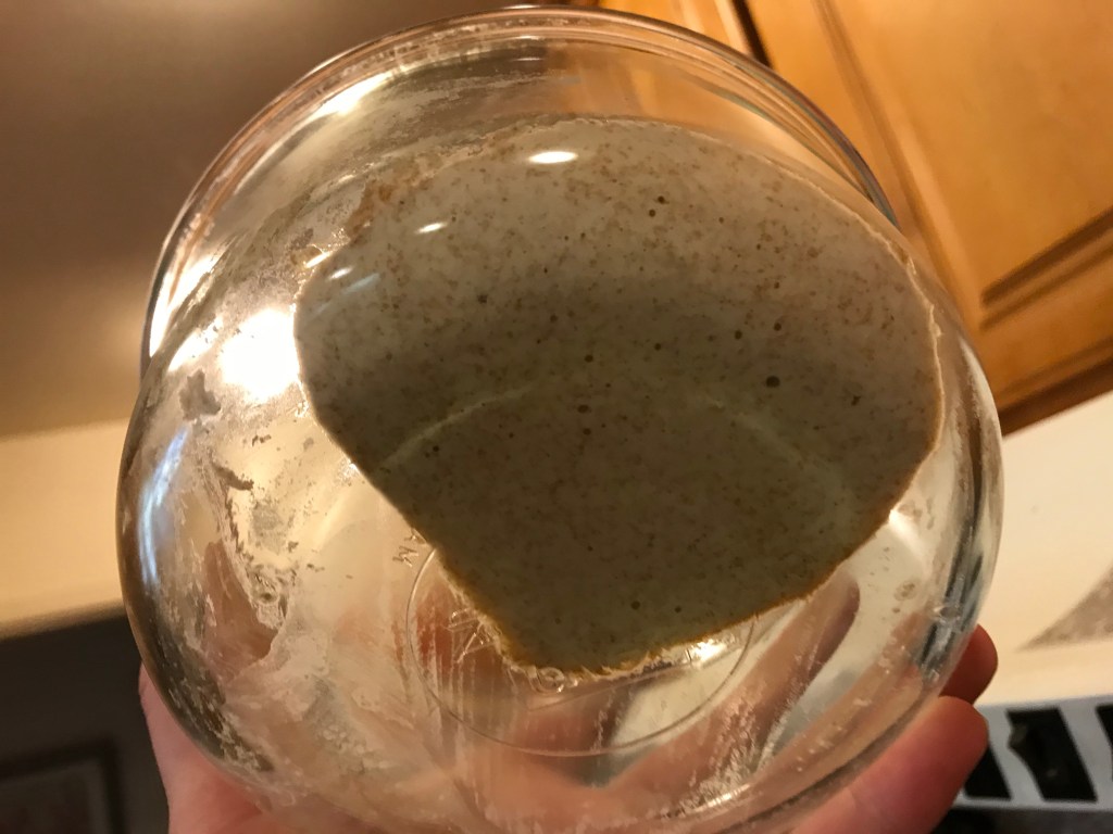 Today woke up early to recapture my … microbes. Same mild smell of cheesy barf with hint of glass and metal. I wonder if the glass is breaking? No gas formation, still the gooey mess it has always been.