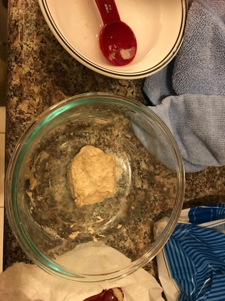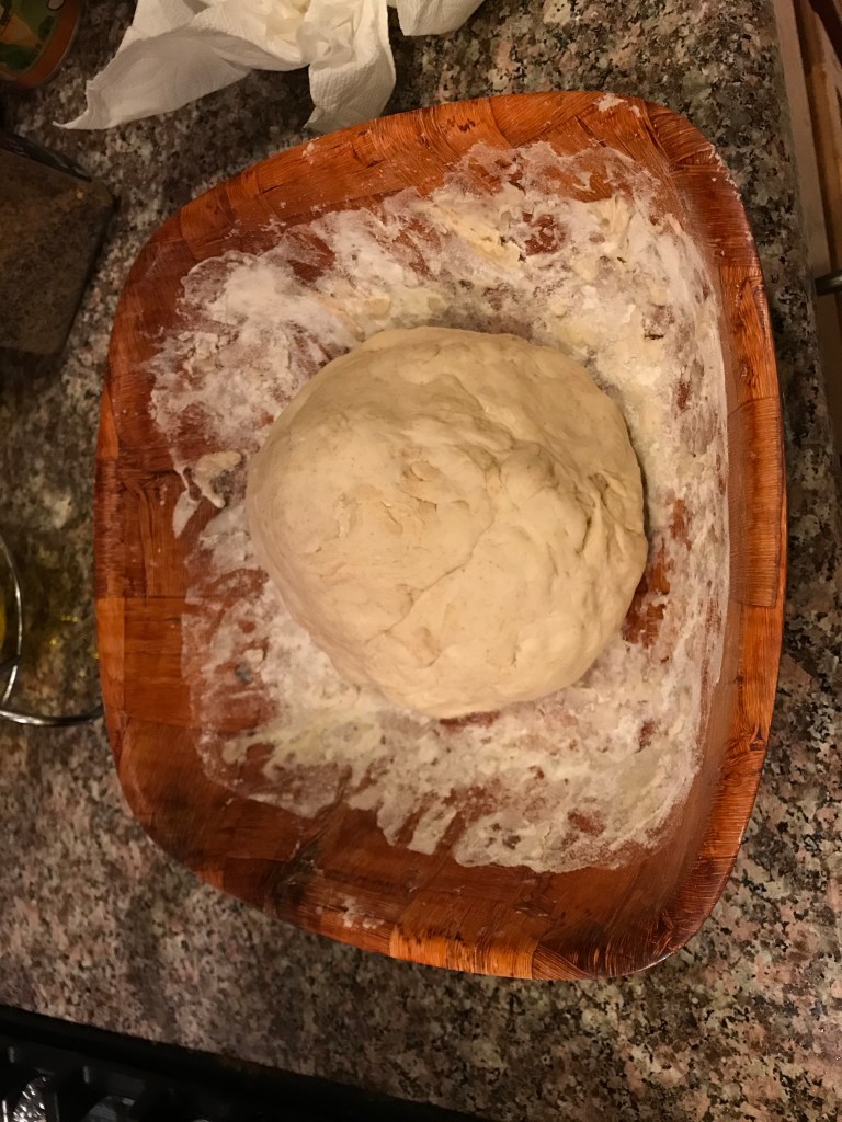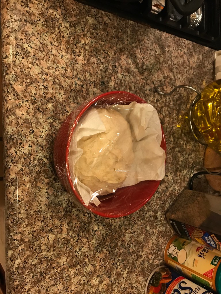 The dough was reshaped back into a ball before placed into a large bowl with paper towel covered with flour. The bowl was covered with plastic wrap because the idea of the towel didn’t work me. I ran out of cloth towels but I’be seen Binging with Babish uses plastic for this rising part. The dough set for rising effect for 3 hours.