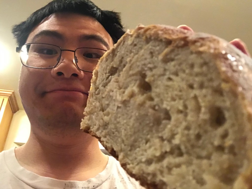 Mmmmmhmm. The inside is slightly wet and it smells like the cheesy barf but after a few minutes the bread smelled exactly like a sourdough! The top had a nice crunch to it too! :O